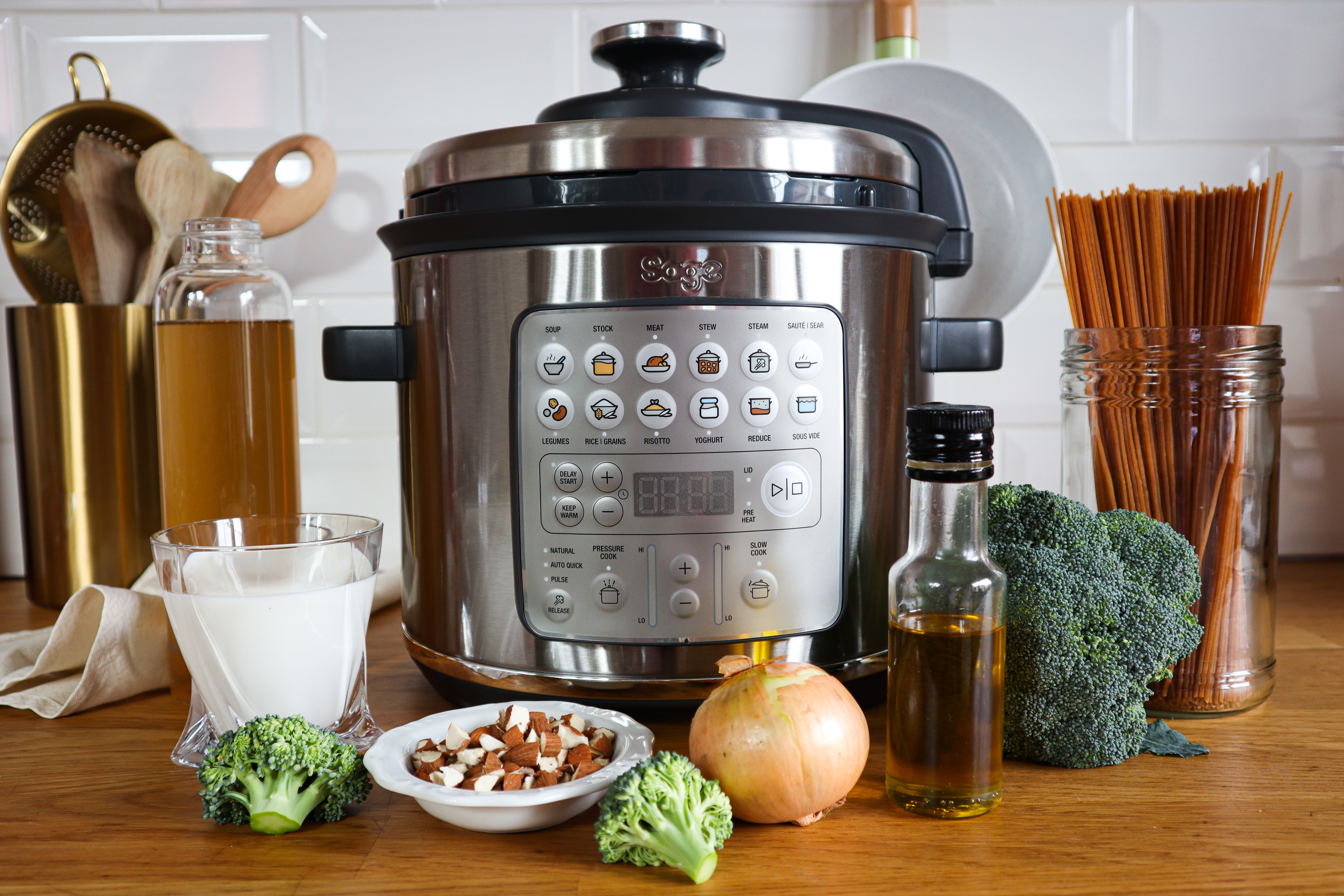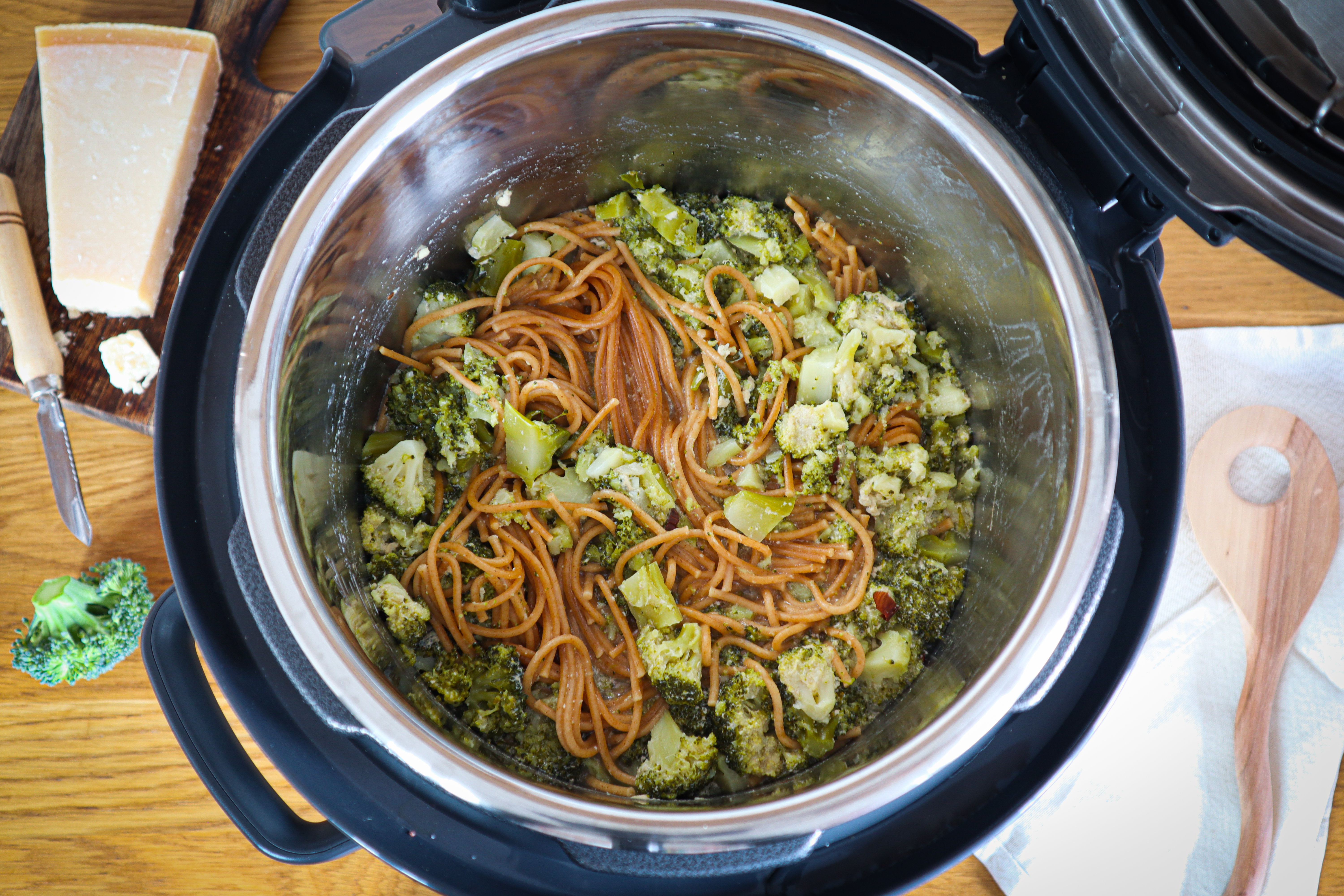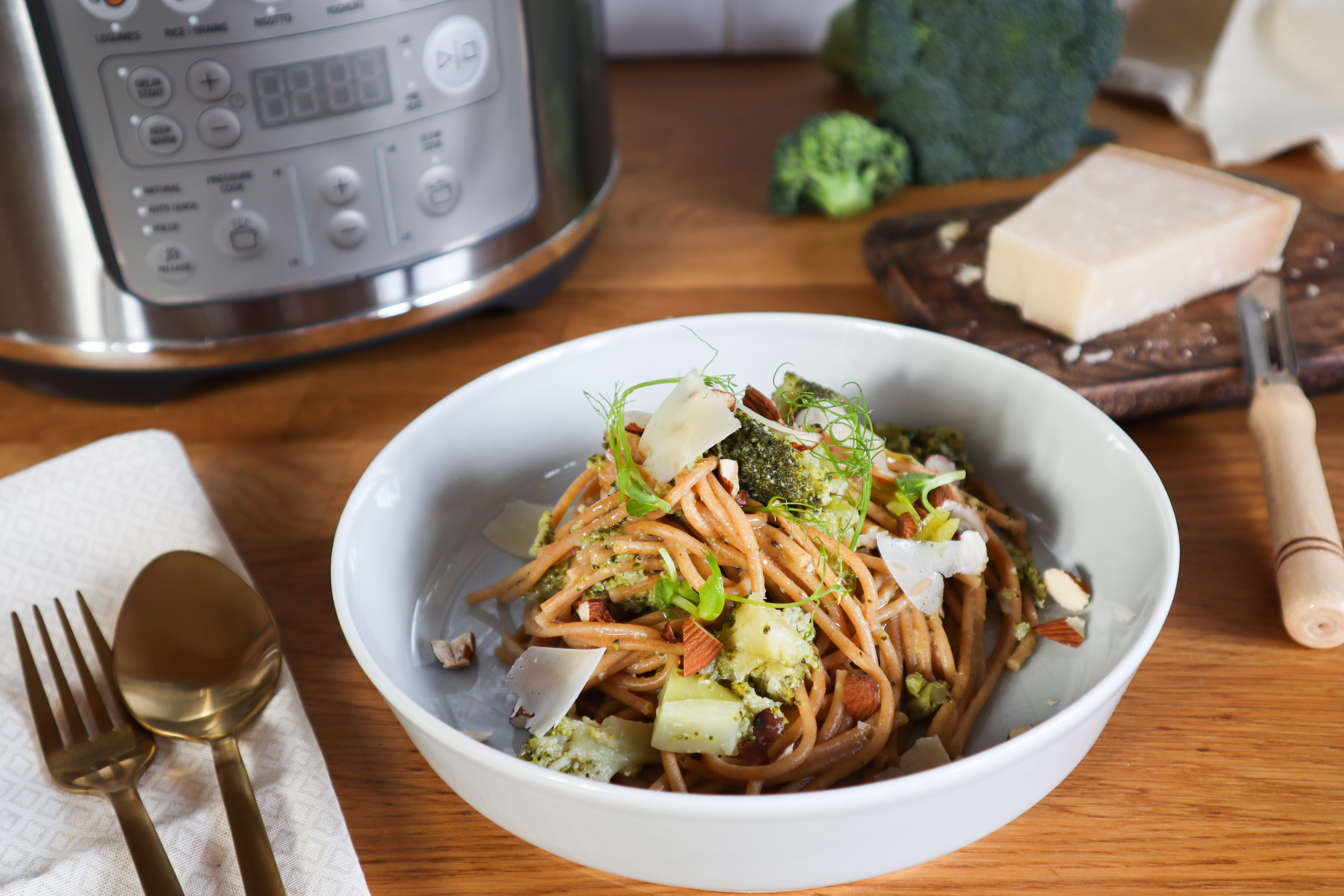 Nemáte času nazbyt, a přesto si chcete pochutnat na poctivém domácím jídle? Vyzkoušejte tyto brokolicové celozrnné špagety připravené v jednom hrnci. My jsme použili tzv. multicooker, použít však můžete jakýkoliv tlakový nebo i běžný hrnec. Za pár minut získáte skvělý krémový pokrm, aniž byste museli špinit hromadu nádobí.