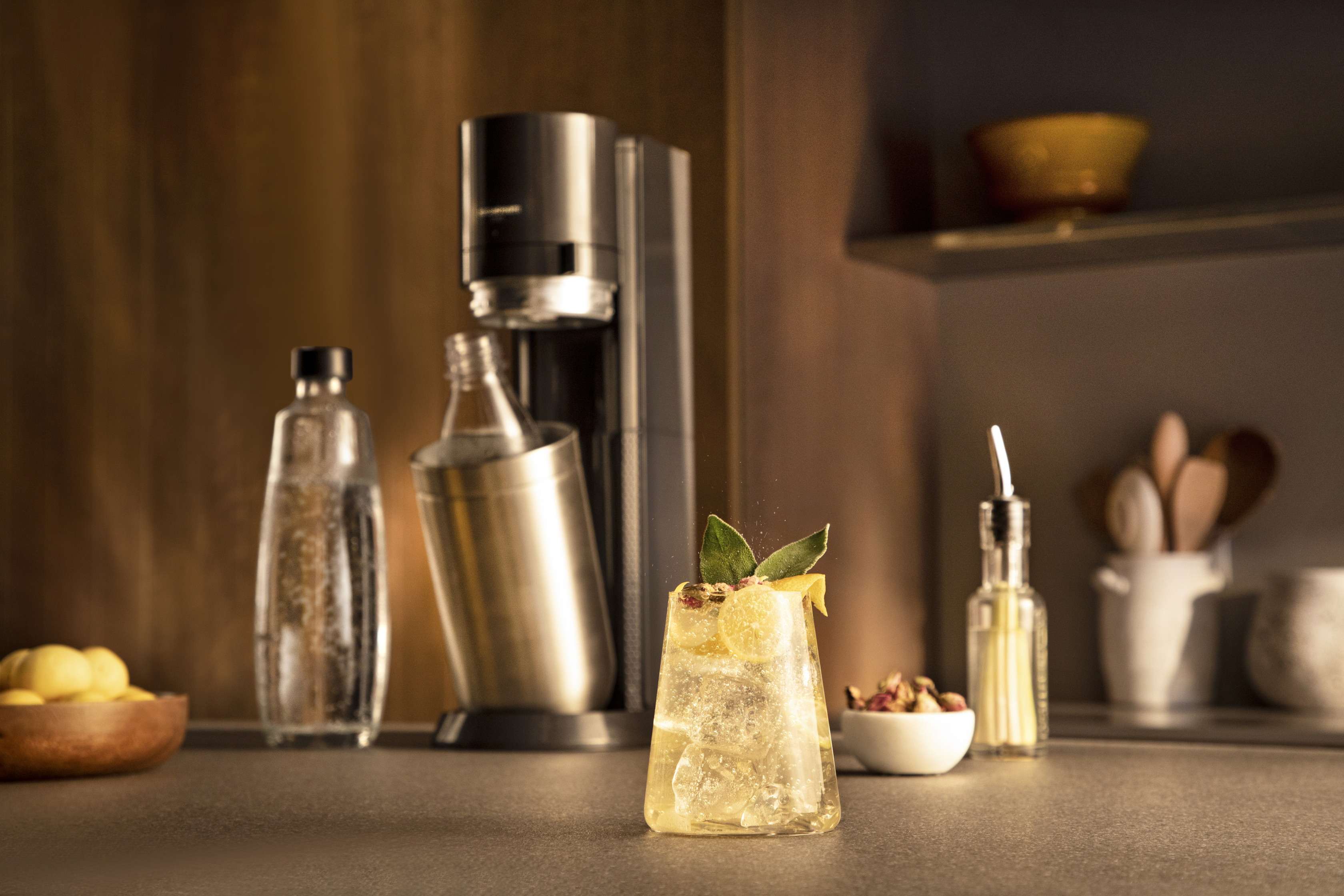 Nejprve připravte čerstvou perlivou vodu ve vašem výrobníku SodaStream. Do elegantní sklenice nasypte několik kostek ledu a přidejte plátky citronu a pár sušených růžových poupat. Do perlivé vody opatrně přilijte příchuť Bezinka Zero podle své chuti – ideálně po stěně lahve, a poté jemně promíchejte. Hotový nápoj přelijte do připravené sklenice a ozdobte lístky šalvěje a kouskem citronové kůry. Svěží, lehký a krásně letní drink, který si zamilujete na první doušek.