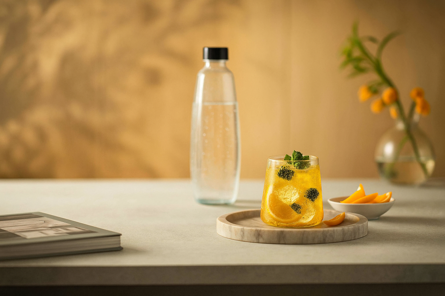 Nejprve si připravte čerstvou perlivou vodu ve svém výrobníku SodaStream. Do hotové perlivé vody přilijte příchuť Marakuja Zero podle své chuti – ideálně po stěně lahve a poté jemně promíchejte. Do sklenice vložte několik plátků pomeranče, borůvky a pár kostek ledu. Zalijte hotovým nápojem a ozdobte lístkem máty. Výsledkem je tropický drink plný chuti, který vás okamžitě přenese do klidného, sluncem zalitého ráje.