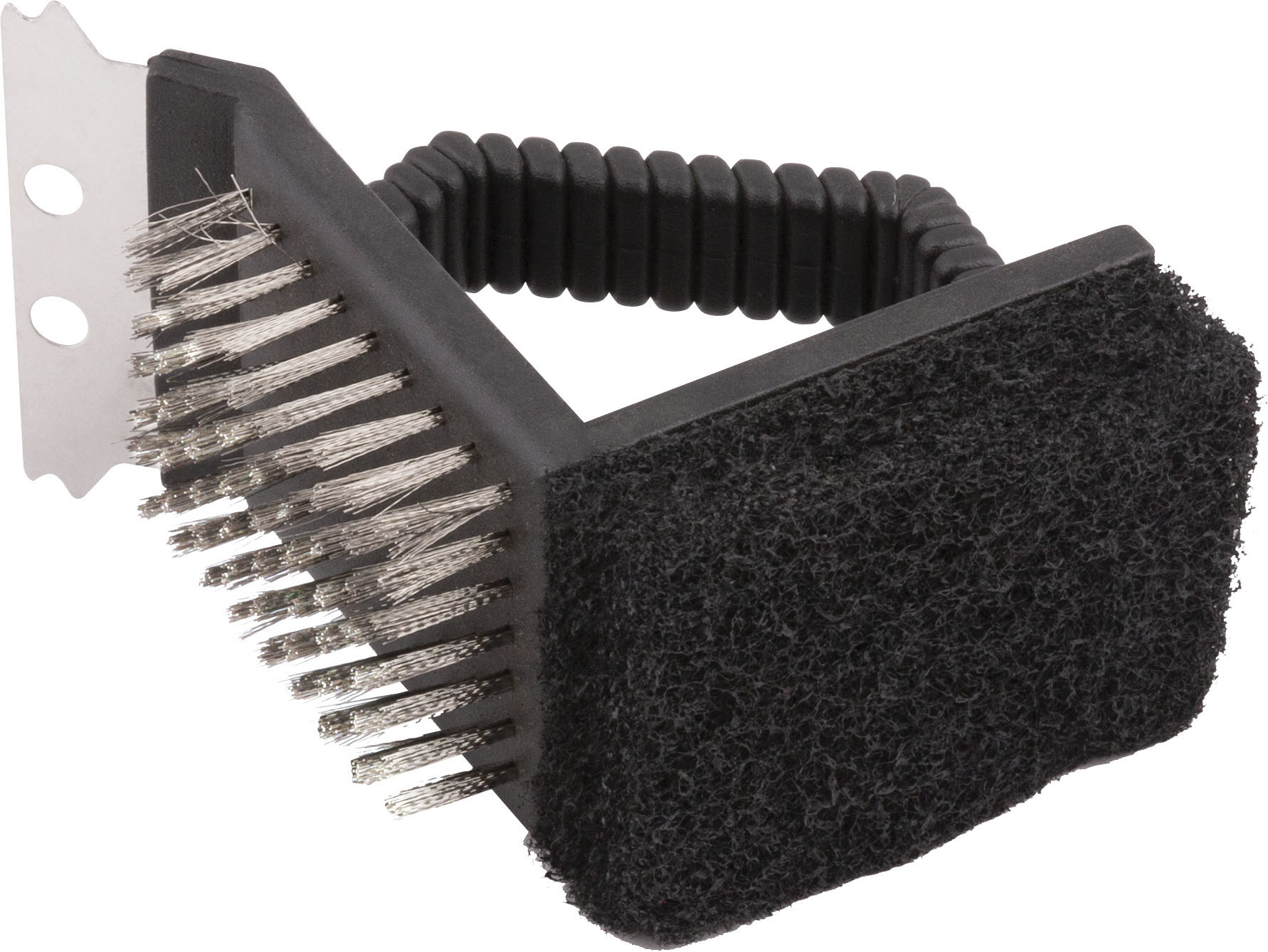 S touto super trojkombinací bude gril jako nový. Praktický kartáč spojuje sílu ocelových štětin, nerezové škrabky a ocelové drátěnky s rukojetí, která pohodlně padne do ruky.