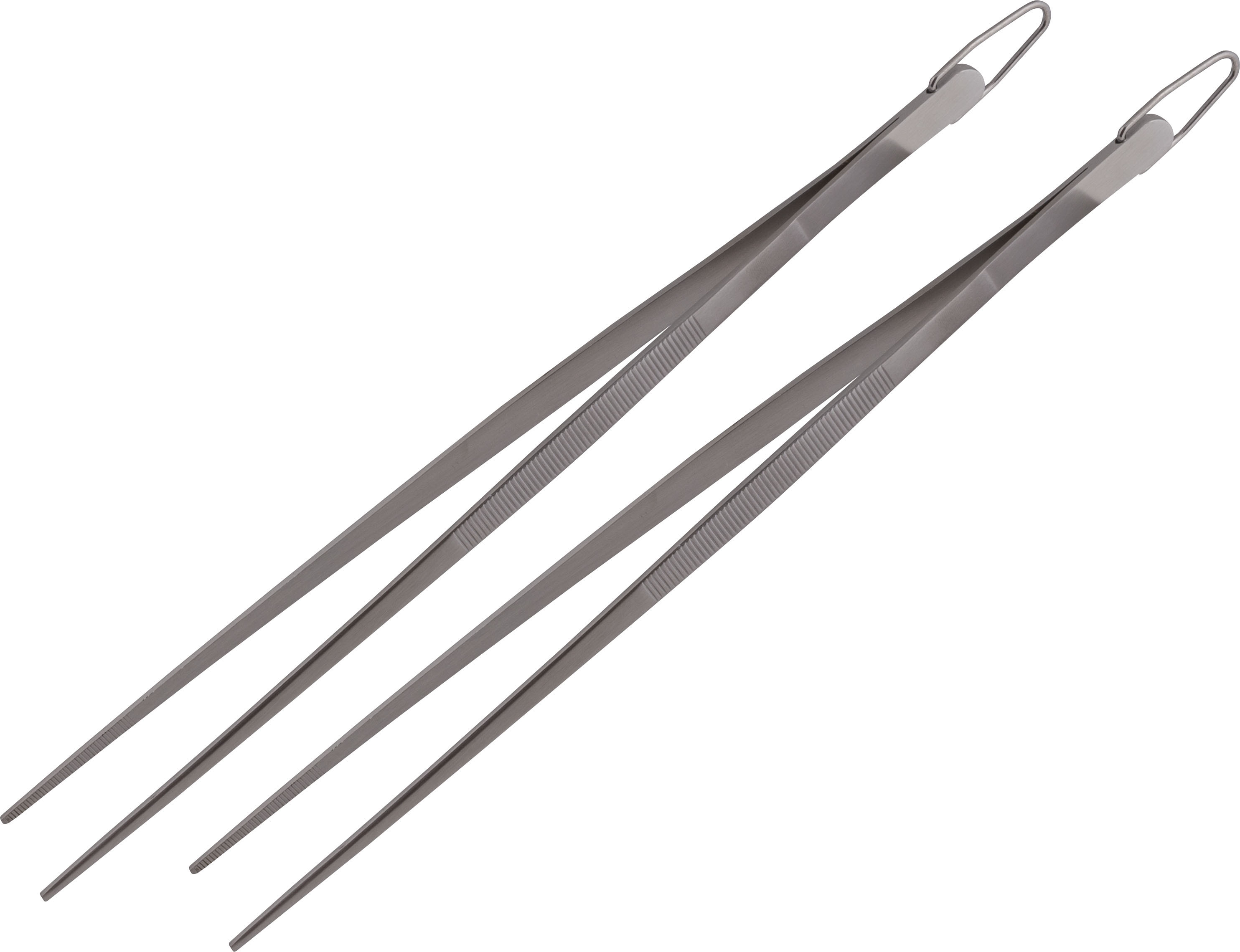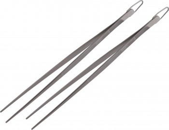 Set 2 pinzet z nerezové oceli je vhodný pro obracení steaků ale i pro jemnější práci, jako je špikování. Délka 30 cm, praktické očko k zavěšení.