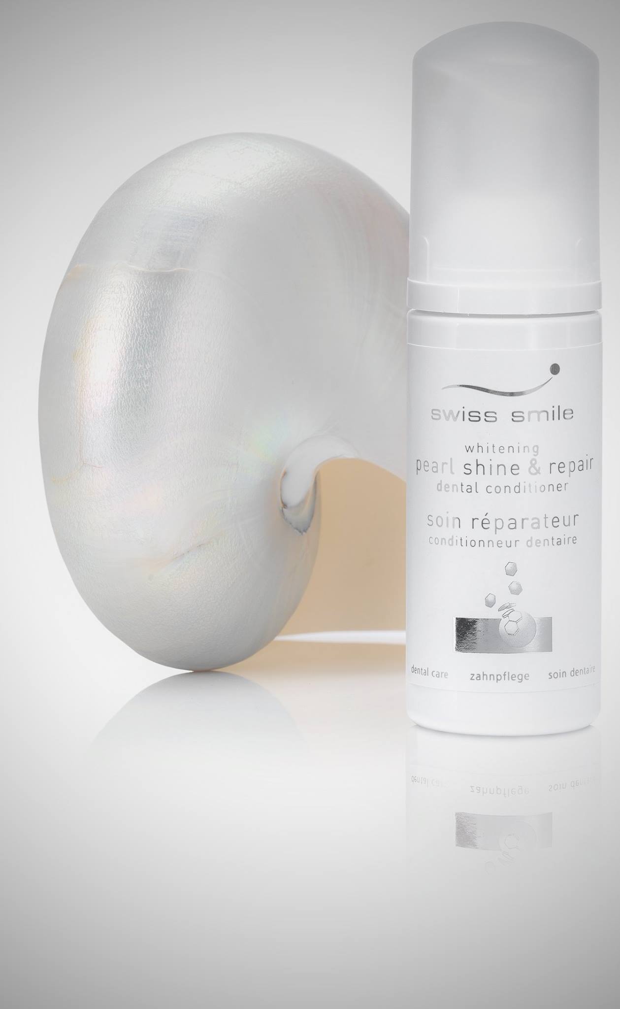 Swiss Smile Pearl Shine Dental Conditioner je dentální pěna s obsahem mikronizované perleti, získané z mořských lastur, zpracované unikátním procesem tak, aby dokonale a hladce obnovila zpět zubní sklovinu a citlivé krčky na místech, kde byly poškozeny. S nejvyšší jemností tak léčí povrch zubu a zajišťuje prevenci tvorby zubního plaku. Krystalická struktura bílé pěny zároveň efektivně přitahuje nečistoty a představuje tak jemnou hloubkovou ochranu citlivých zubů. Dentální kondicionér dále pro ochranou péči obsahuje fluorid, xylitol, výtažky zeleného čaje a protizánětlivý allantonin.