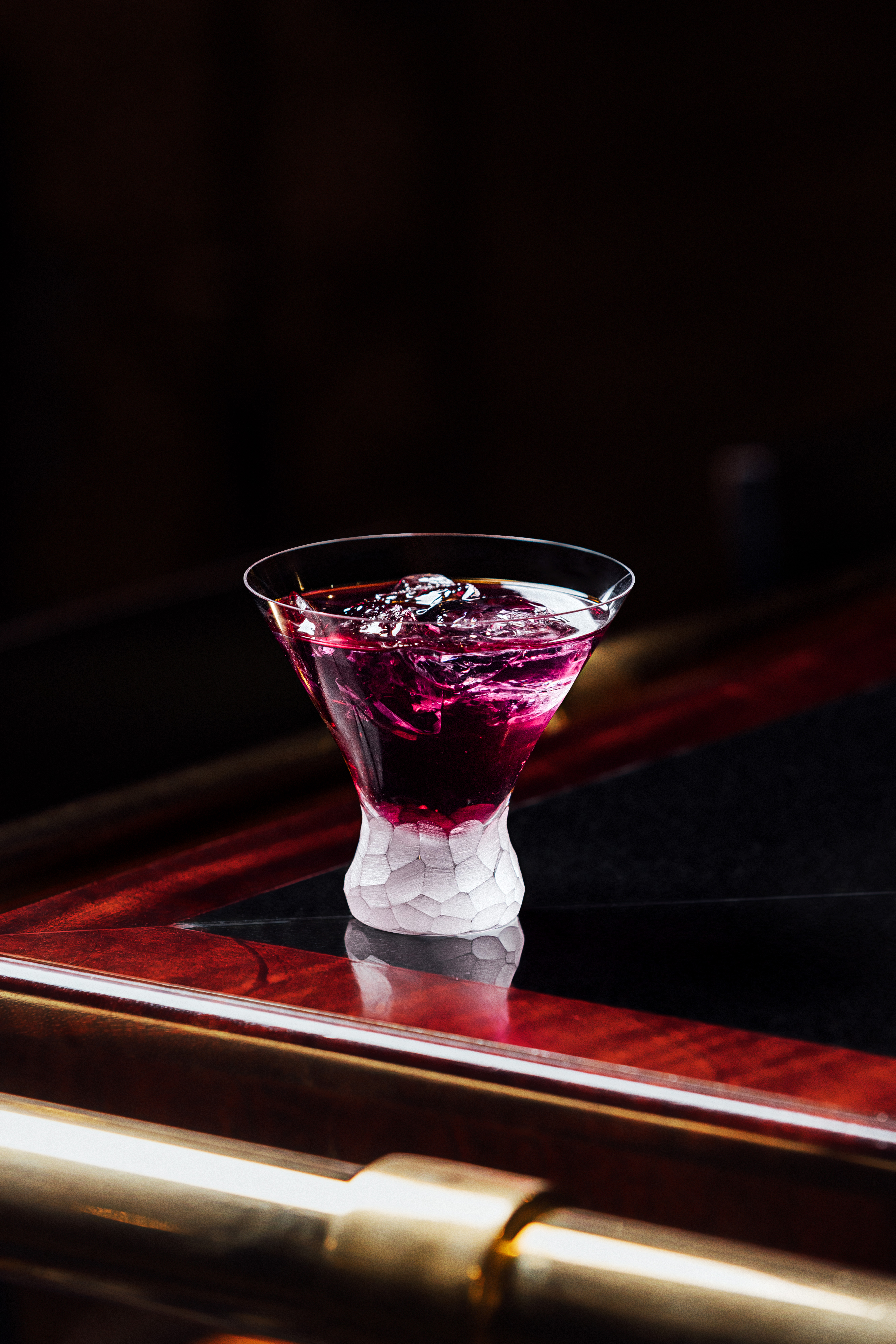 V případně zářivého koktejlu Červená se postupuje stejně jako u jeho fialové alternativy. V receptu najdete jasmínový gin, ibiškovou limonádu, cukrový sirup, ale také puré z jahod a červeného rybízu. Koktejl se servíruje s ledem jako osvěžující long drink ve vysoké sklenici Moser.
