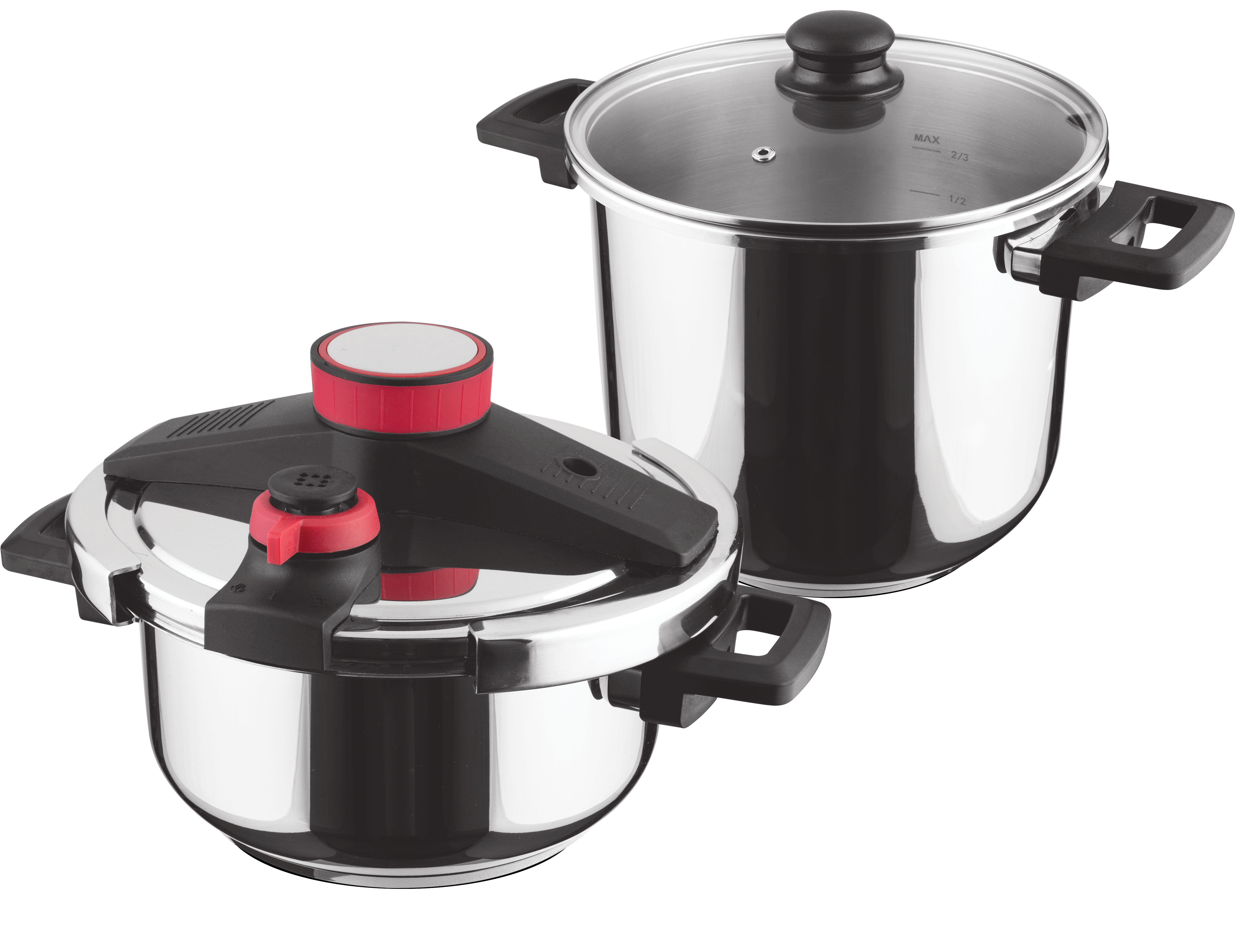 Sada kvalitních tlakových hrnců o průměru 22 cm z prvotřídní nerezavějící oceli 18/10 a velmi odolného plastu s objemem 4 a 7 l (výška 12 cm a 22,3 cm) zajistí rychlé a šetrné vaření. Vícevrstvé sendvičové dno je vhodné na všechny typy sporáků.  Hrnce jsou vybaveny indikátorem tlaku, dvojím pojistným bezpečnostním ventilem proti přetlaku a masivními držadly pro snadnou manipulaci.
