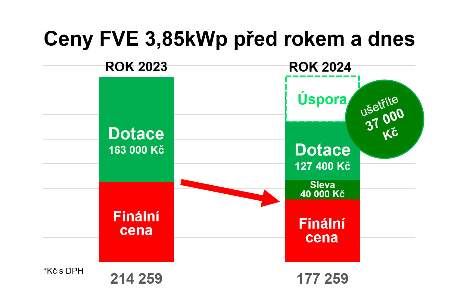 Společnost Schlieger nabízela v roce 2023 základní sestavu FVE 3,85 kWp za cenu 214 000 Kč. Vzhledem ke zlepšení dostupnosti jednotlivých komponent a snížení jejich DPH (z 15 na 12 %) se cena této konfigurace v tuto chvíli pohybuje od 177 000 Kč – tedy o 37 000 Kč levněji oproti minulému roku.