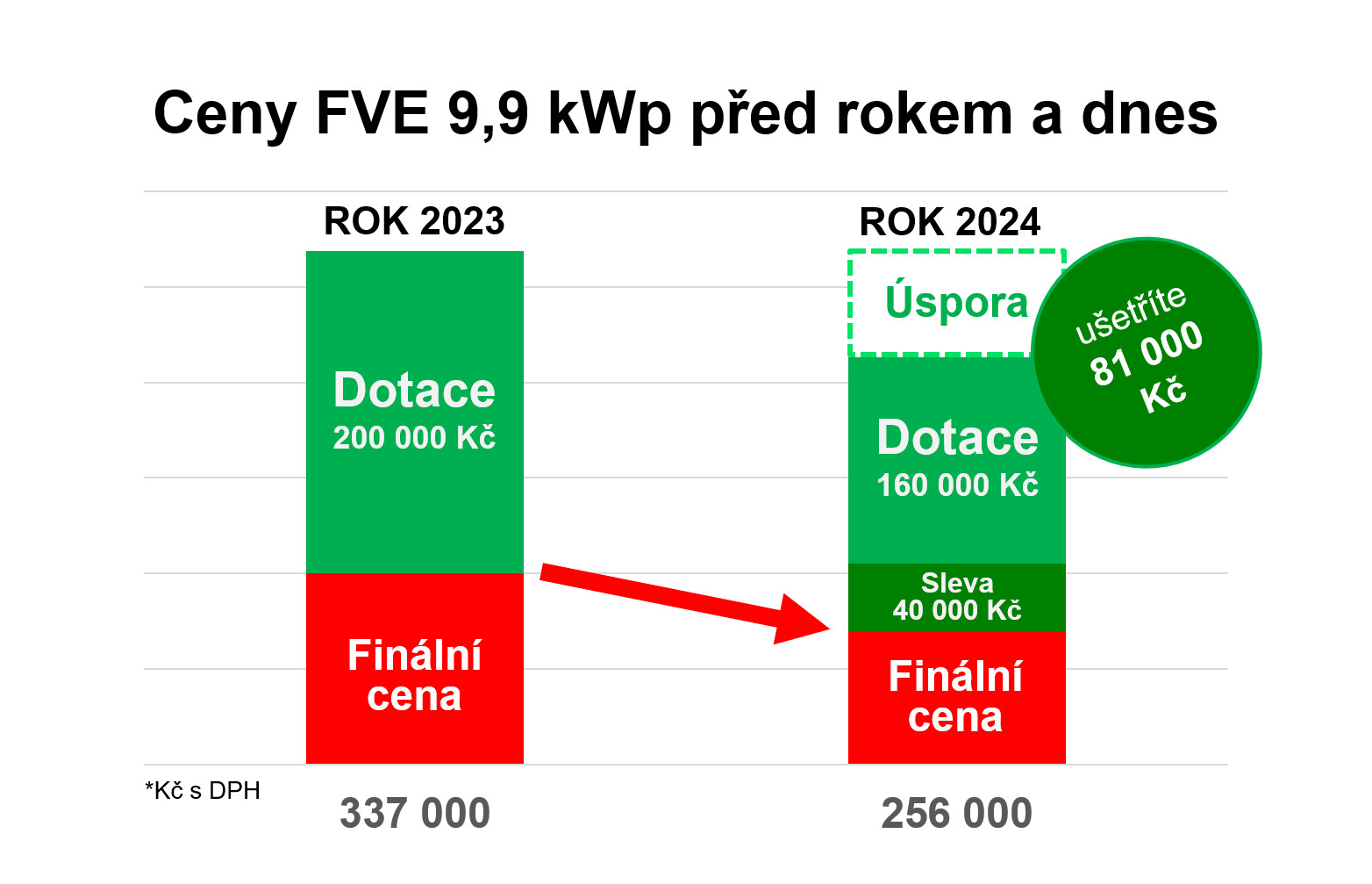 Nejen úprava dotačních programů, ale i další faktory ovlivnily ceny fotovoltaických elektráren, které jsou nyní na svém minimu. I přes snížení dotací, díky snížení DPH a poklesu cen komponentů si lze nyní pořídit vlastní fotovoltaickou elektrárnu za levnější ceny než v minulosti. Navíc některé společnosti začali nabízet dodatečné slevy, aby kompenzovali snížení dotací a dorovnali tak pokles státní podpory svým klientům. Společnost Schlieger pro své zákazníky nyní nabízí slevu za pořízení 40 000 Kč.
