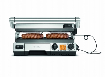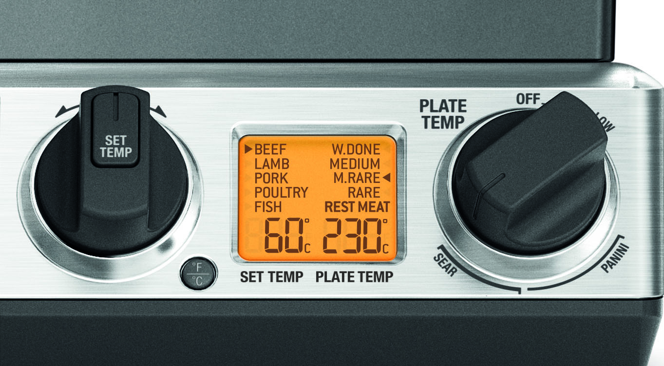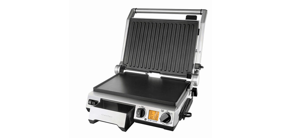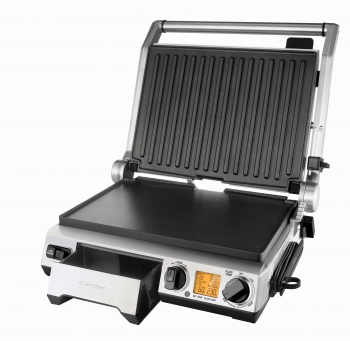 Elektrický kontaktní gril Catler GR 8050 přichází s vynikající nápovědou: na přehledném displeji nastavíme druh masa, a doporučenou teplotu podle toho, jak propečené maso chceme mít. Teplotní sonda pak podle zadaného druhu masa bezpečně pozná, kdy je hotovo. Grilovací plocha se dá jednoduchým pohybem rozevřít a najednou tu máme místo kontaktního grilu velkou grilovací plochu, jejíž žebrovanou část využijeme zejména na přípravu masa a ryb, hladkou zase na lahodnou zeleninu či ovoce (na to bychom neměli zapomínat). Inteligentní senzor grilu bezpečně ohlídá, zda se někde nezměnila teplota a postará se okamžitě o nápravu.
