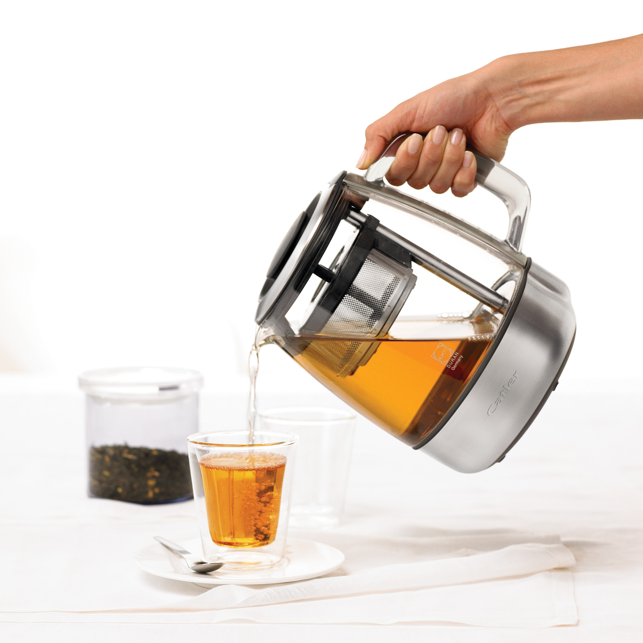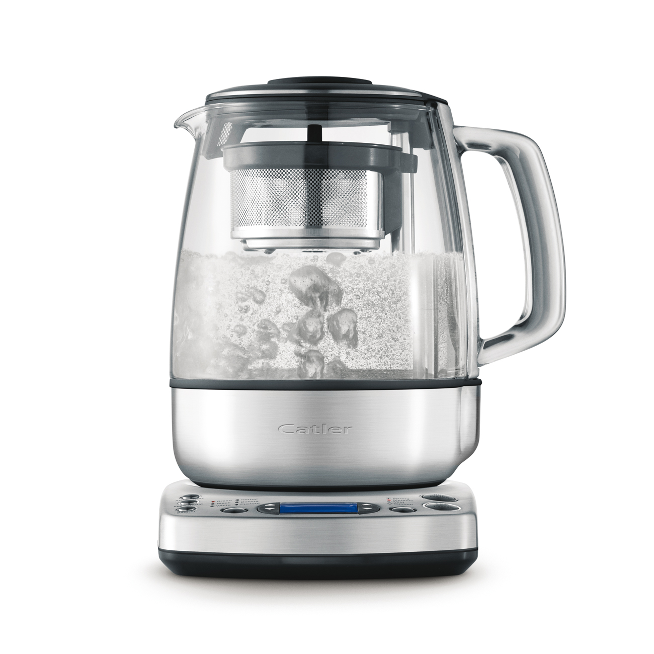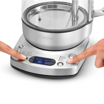 K přípravě vynikajícího čaje je ovšem ještě třeba krom přesné teploty znát správnou dobu louhování. Nejen to, měli bychom ji také dodržet. To také nemusí být vždy snadné a dlouho louhovaný čaj nám může pokazit chuť. Na tohle ale také pamatovala společnost Catler, když na trh dodala rychlovarnou konvici TM 8010. U ní si můžeme vybrat teplotu vody na zelený, čaj, černý, bílý, oolong (vyslov wu lung – žlutozelený, řízeně oxidovaný čaj) nebo čaj bylinkový. Krom toho si můžeme nastavit přesnou teplotu vlastní. To ale není jediná přednost. Přes sklo konvice Duran Schott můžeme pozorovat sítko na čaj, které se podle doporučené doby louhování toho, kterého konkrétního čaje samo do vody zanoří a opět vynoří. Pochopitelně, že se nemusíme řídit doporučením a sami si čas louhování určit. Je tak vyloučené, že bychom dobu louhování mohli překročit. V tom všem nám bude nápomocný podsvícený displej s potřebnými údaji. Konvice neslouží jen k přípravě čaje, ale můžeme si v ní i ohřát vodu k přípravě kávy, čokolády nebo v nastávajících chladných dnech třeba vody na grog.