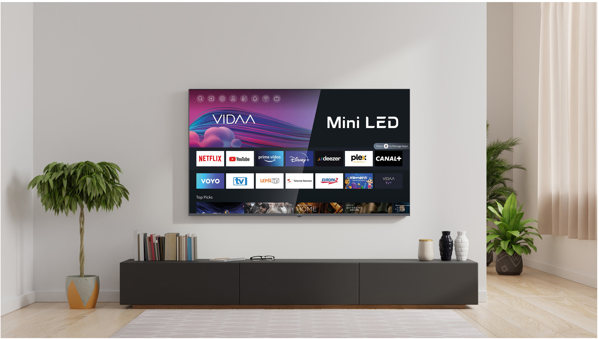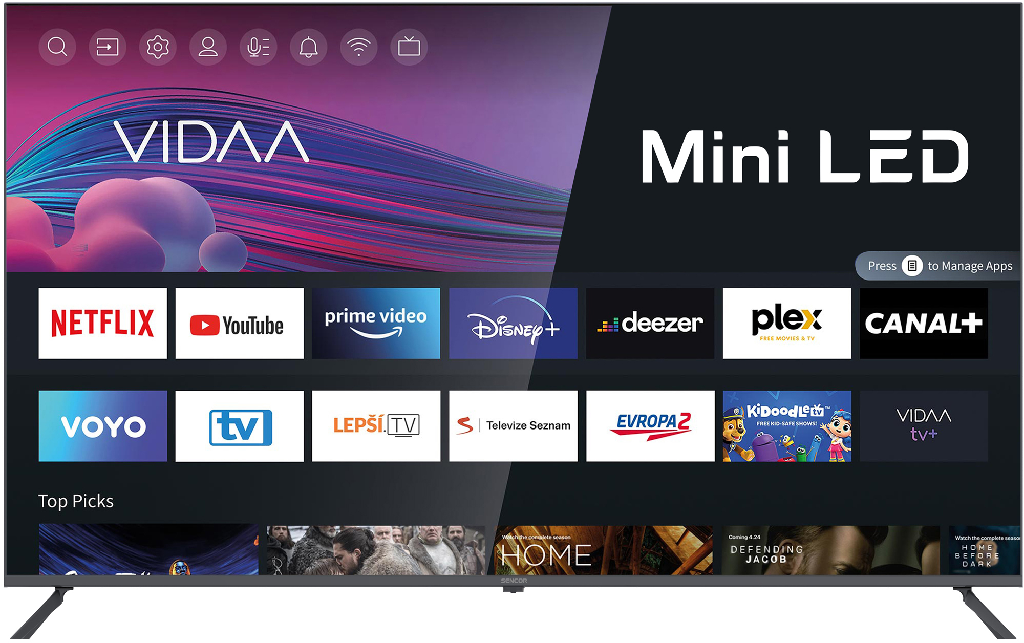 O chytré funkce televizoru se stará operační systém VIDAA, nabízející uživatelům intuitivní a personalizovaný způsob ovládání. S důrazem na snadnou navigaci umožňuje VIDAA rychlý přístup k oblíbeným aplikacím, ať už na úvodní obrazovce nebo prostřednictvím různých režimů zobrazení. Integrované aplikace pro streamování videa, hudbu a populární služby jsou samozřejmostí. Systém vyniká rychlou odezvou a uživatelsky přívětivým rozhraním. V televizorech SENCOR s operačním systémem VIDAA tak najdete globální služby jako NETFLIX, DISNEY+, YOUTUBE, AMAZON PRIME nebo lokální VOYO, SledováníTV, Lepší.TV, Televize Seznam, Pohádky či ANTIK TV.