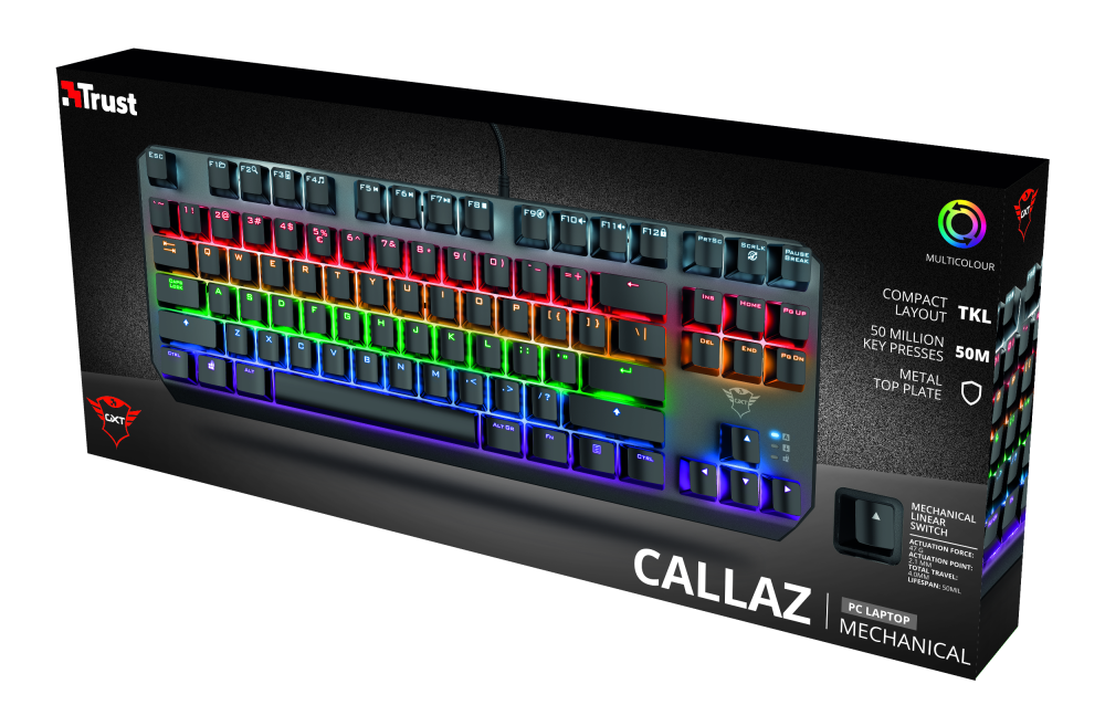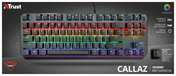 29.3.2022, Praha – Nová mechanická klávesnice Trust GXT 834 Callaz TKL s citlivými mechanickými spínači Outemu vydrží až 50 milionů stisknutí jednotlivých kláves. Její kompaktní rozměry vycházejí z jejího provedení bez deseti numerických kláves v pravé části. Ponechává tak více místa na stole pro další periferie.