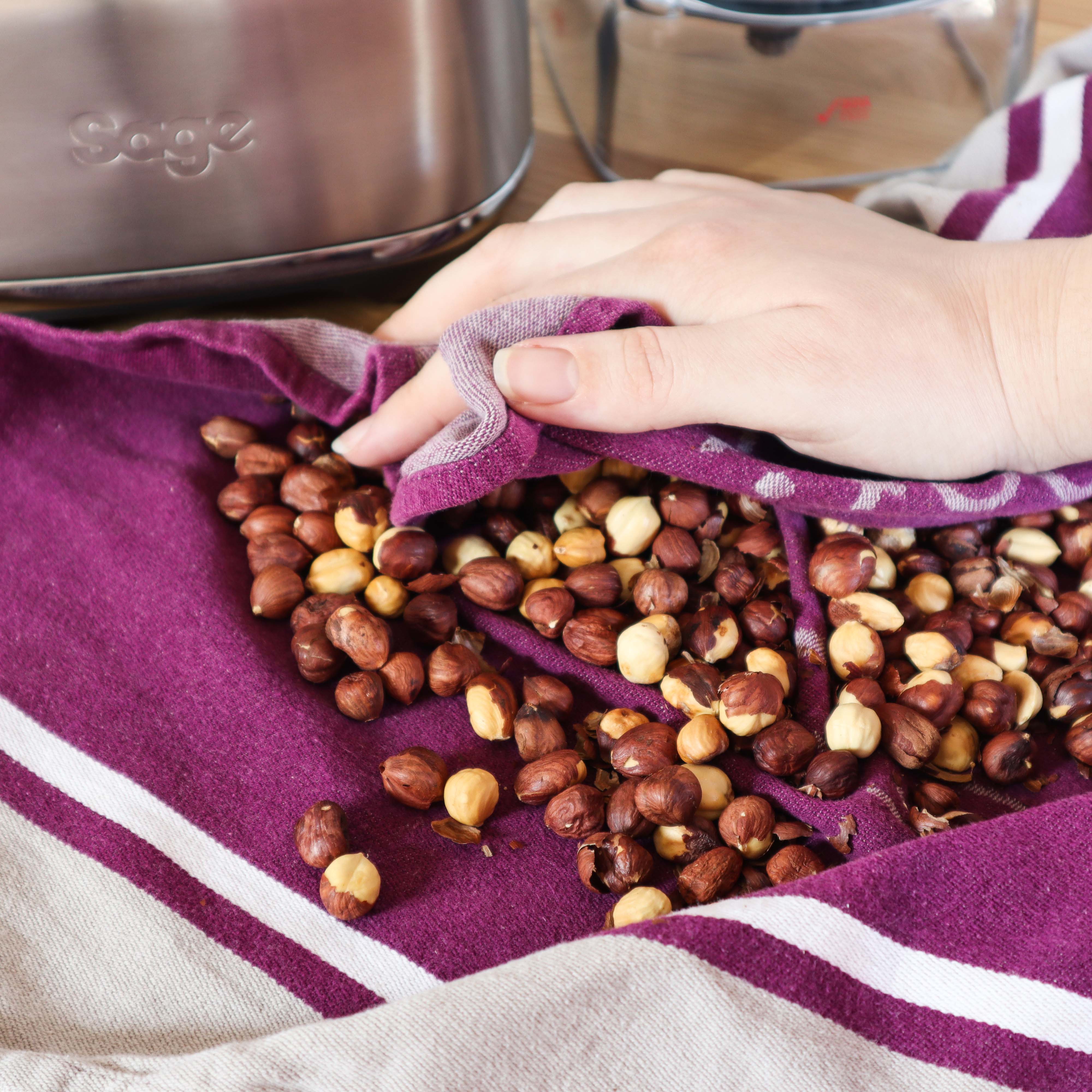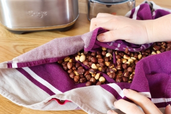 - Oříšky vyndejte z trouby a nechte úplně vychladnout. Poté si je dejte do kuchyňské utěrky a třete je o sebe, abyste se zbavili co nejvíce slupek.