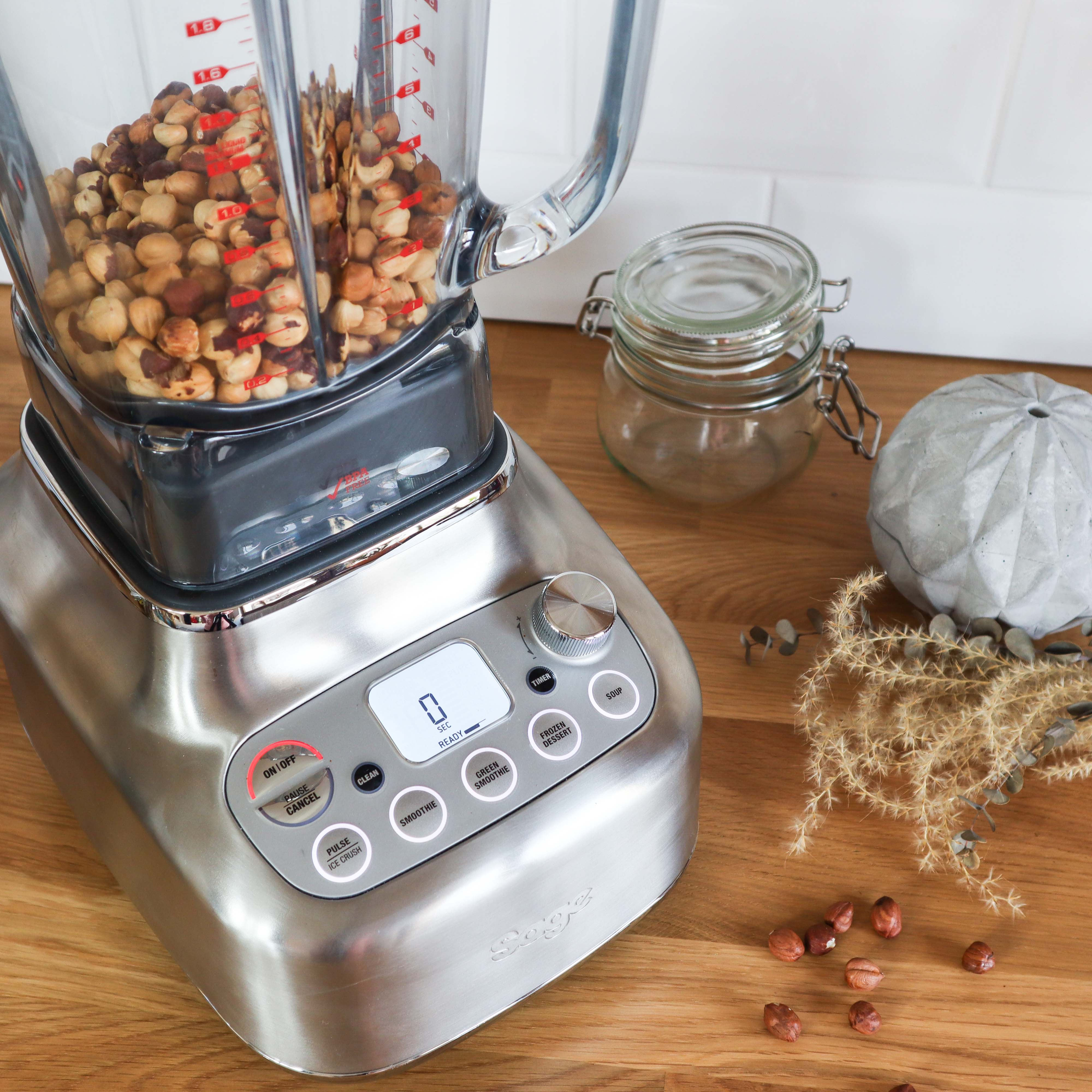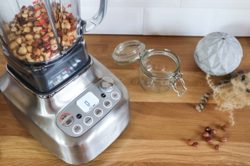 - Oloupané a opražené oříšky dejte do nádoby mixéru SAGE SBL920. Nasaďte a zajistěte víko nádoby pro bezpečné mixování.
