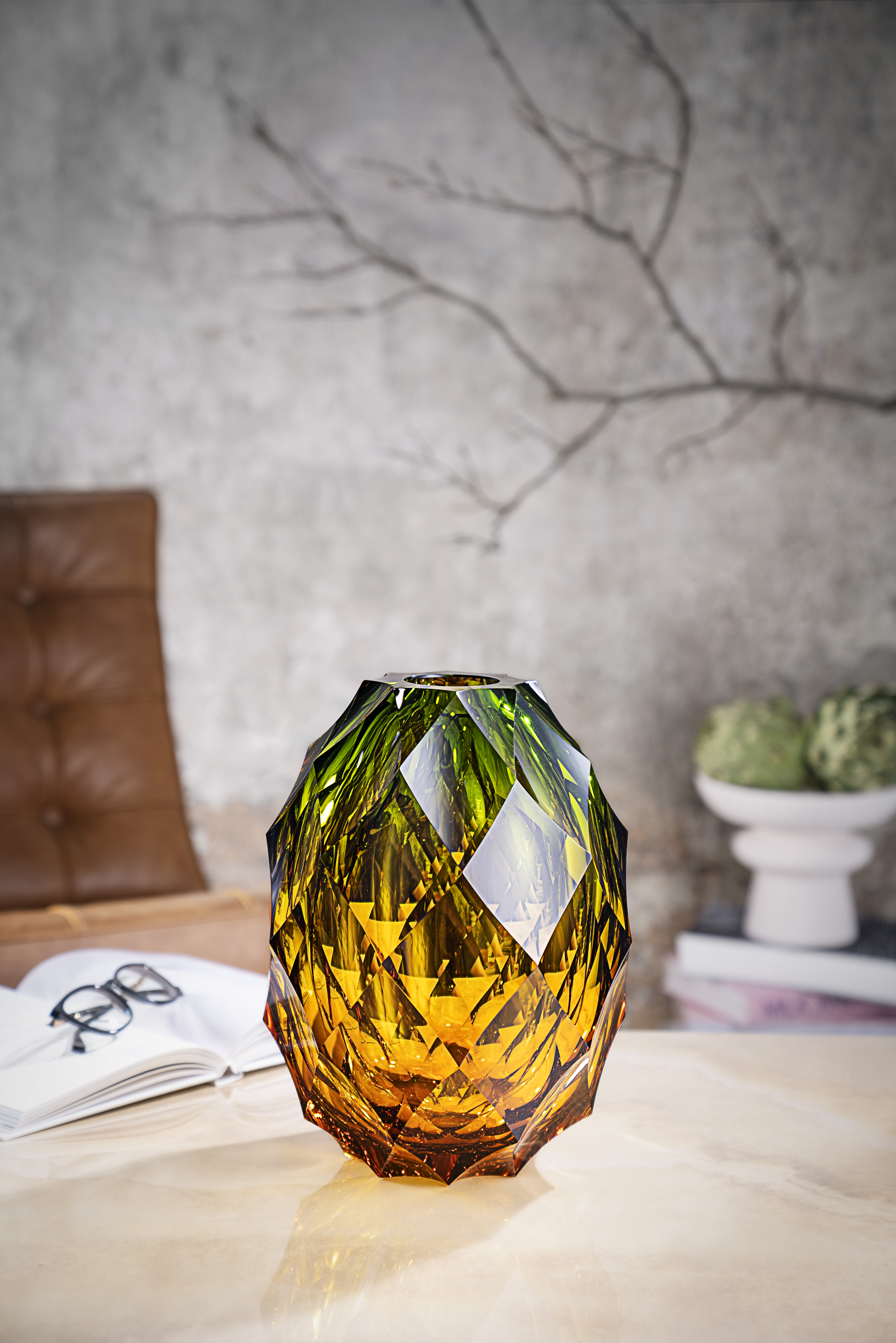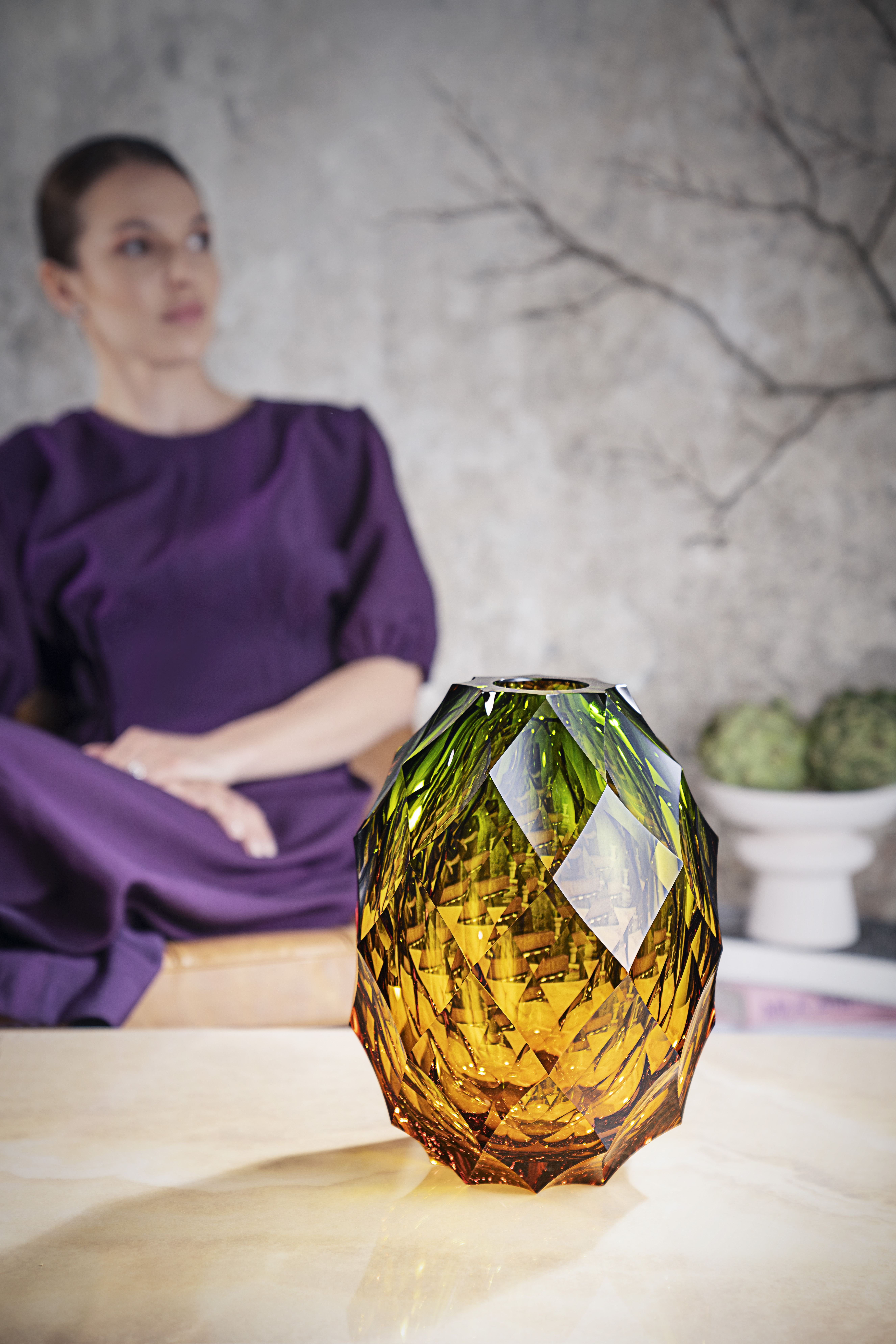 Karlovarská sklárna Moser rozšiřuje řadu svých unikátních produktů o symbol přátelství, pohostinnosti, vřelosti, ale i úspěchu – vázu Ananas. Ta vyniká nejen kompozicí připomínající realistický vzhled ostnatých květů ananasu, ale i promyšlenou kombinací barev. Medově zbarvené topasové sklo s lehkým nádechem zelené podtrhuje propracovaný vertikálně broušený design navržený Lukášem Jabůrkem, autorem předchůdce Ananasu – ikonické vázy Hruška.